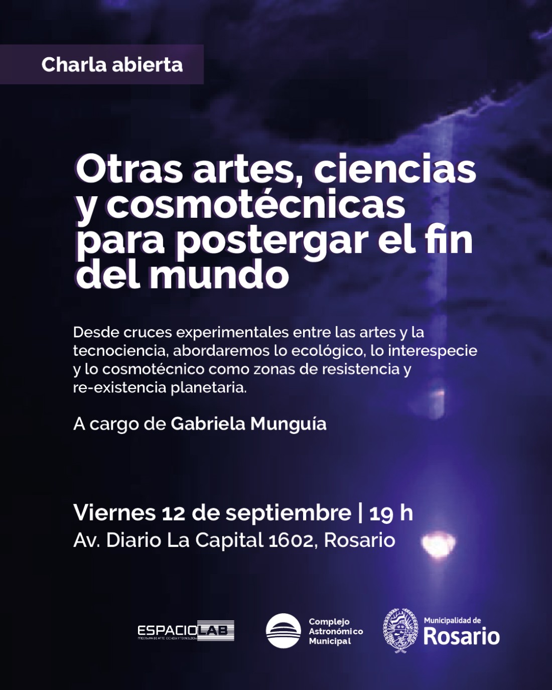 El Programa EspacioLab del Complejo Astronómico Municipal, dependiente de la Secretaría de Cultura, de la Municipalidad de Rosario, invita a la charla abierta "Otras artes, ciencias y cosmotécnicas para postergar el fin del mundo", a cargo de Gabriela Munguía*, dando inicio a la 10ª edición de Laboratorio Abierto 2025, un espacio experimental y colaborativo donde las y los interesados en las artes electrónicas puedan encontrarse y compartir experiencias en un ámbito adecuado y con un acompañamiento acorde para desarrollar sus proyectos vinculados de diversos modos a las relaciones entre artes, ciencias y tecnologías.