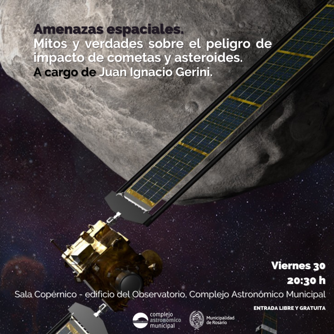 Por tal motivo, conjuntamente con la Asociación Amigos del Observatorio y Planetario de Rosario, nos sumamos a la agenda de eventos internacionales del #AsteroidDay, y realizaremos una charla sobre "Amenazas espaciales. Mitos y verdades sobre el peligro de impacto de cometas y asteroides". La misma estará a cargo de nuestro compañero Juan Ignacio Gerini, del equipo del Planetario. Repasaremos cuáles son los cuerpos menores que podrían colisionar con la Tierra y evaluaremos qué peligro representan realmente.